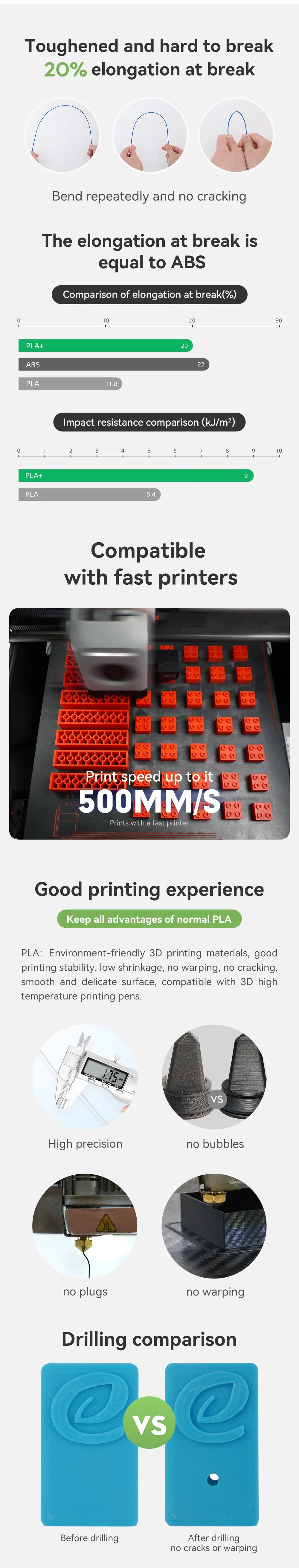 PLA+ نسخه بهبودیافته PLA معمولی است. این ماده استحکام بالاتر و انعطاف‌پذیری بهتری دارد و به‌راحتی نمی‌شکند. دارای انقباض کم، بدون تغییر شکل، بدون ترک‌خوردگی و با دقت بالای چاپ است. از مواد اولیه نشاسته‌ای با منشاء منابع گیاهی ساخته شده و برای چاپ داخلی ایده‌آل است.